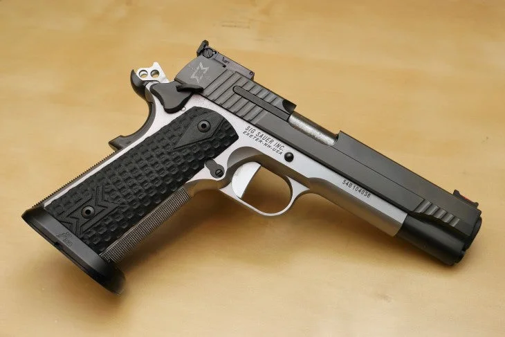 1911 od Sig Sauer v klasickém černém provedení s palisandrovou rukojetí. Tato malorážková pistole je velmi všestranná. Díky velikosti a vysoké hmotnosti pistole vypadá jako „opravdová“ 1911 (v ráži .45 ACP).